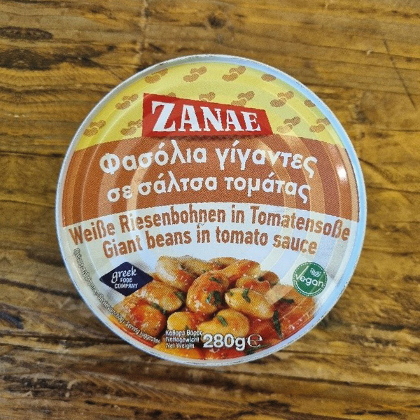 Zutaten: weiße Riesebohnen, Wasser, Tomaten, pflanzliche Öle (Sojaöl und Sonnenblumenöl), Zwiebeln, Tomatenmark, Zucker, Salz, modifizierte Kartoffelstärke, Sellerie, Petersilie, Dill, Pfeffer, Antioxidationsmittel Natriummetabisulfit