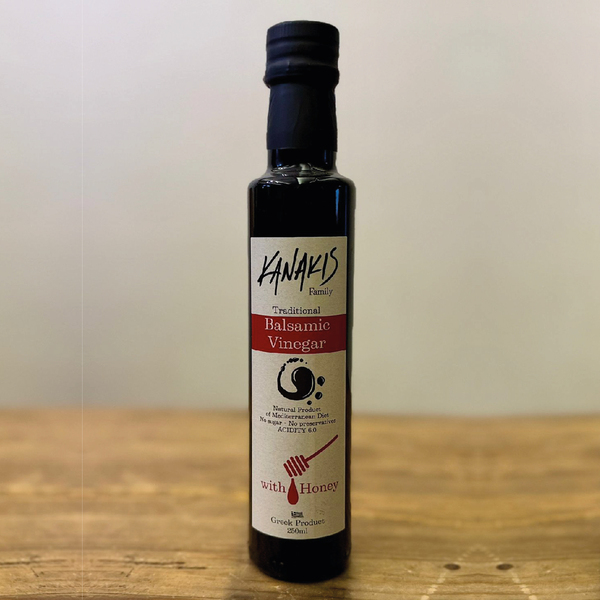 Dieser Balsamico wird aus den Trauben der Region Kalamata hergestellt und reift 4 Jahre lang in Eichenfässern. Er enthält keine Sulfate und keine Karamellfarbe. Es handelt sich um ein 100% natürliches Produkt.